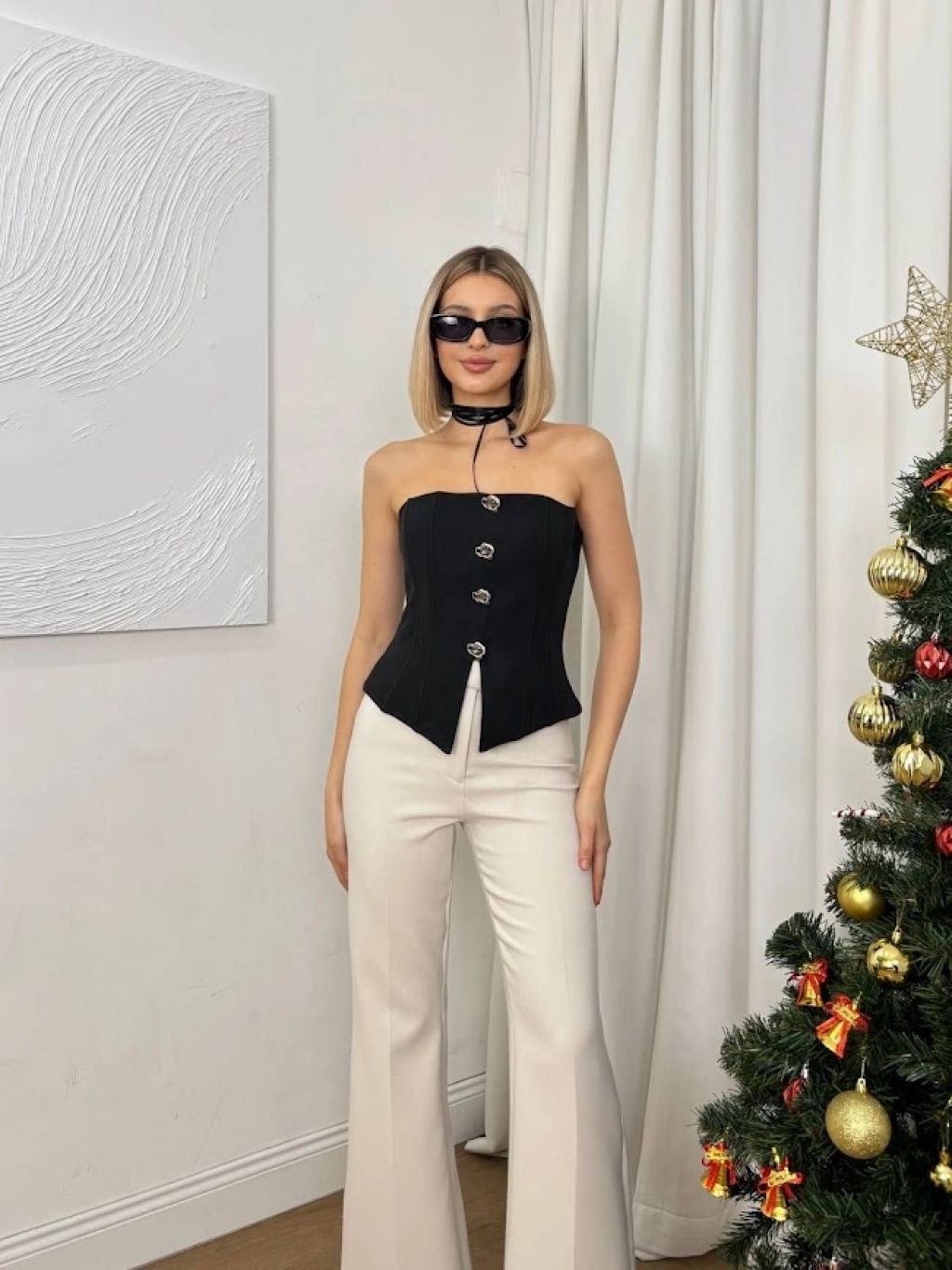 - Straplez yaka tasarımı ile modern ve şık bir görünüm sunar.